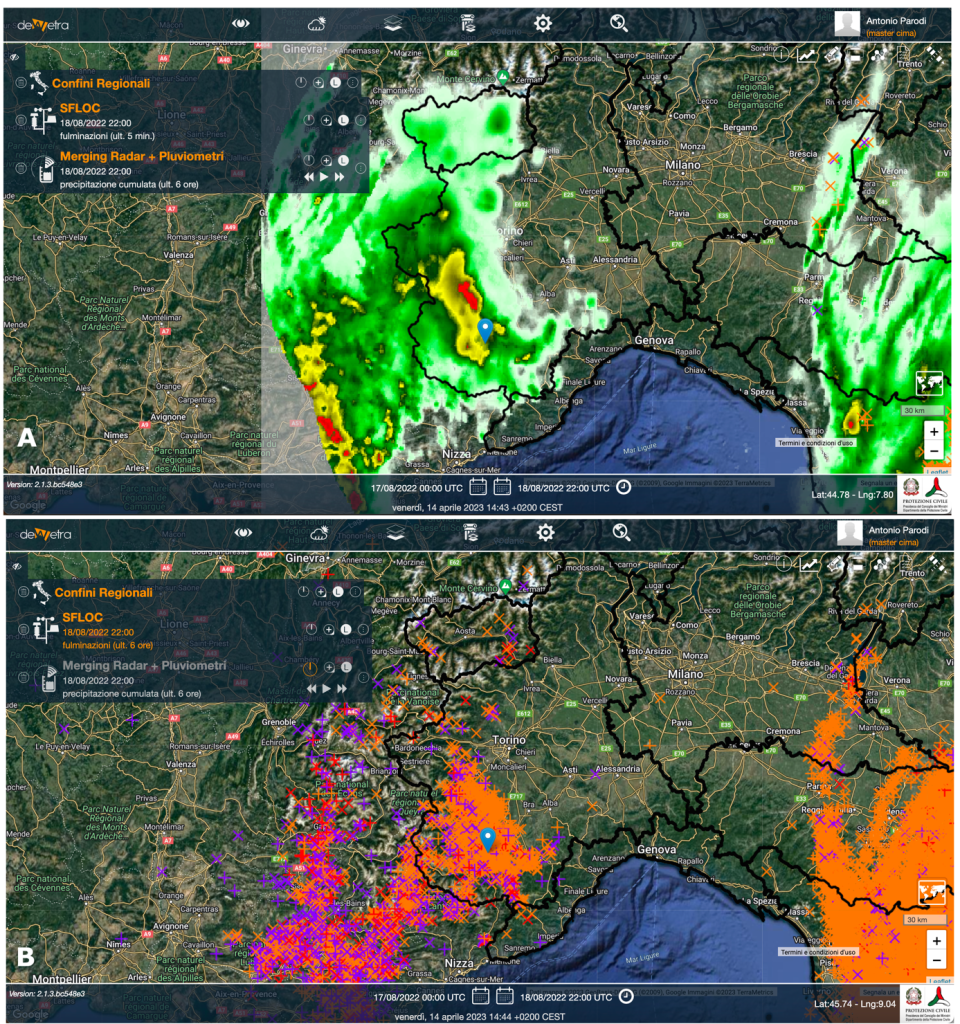 Despite the MCS affecting Northern Italy, the Italian site of the MAGDA project was not directly impacted by this high-impact event. However, on the evening of August 18th, the depression system moved eastward, generating favourable conditions for thunderstorm events. A thunderstorm developed over western Piedmont and impacted the site defined as a use case between 18:00 UTC and 19:00 UTC. During this event, between 40-50mm of rainfall was recorded over the fields of interest, while the surrounding areas received up to 100mm of rainfall in 6 hours. Additionally, a significant number of lightning strikes were observed over the South-Western Piedmont area, indicating intense convective activity in the region.