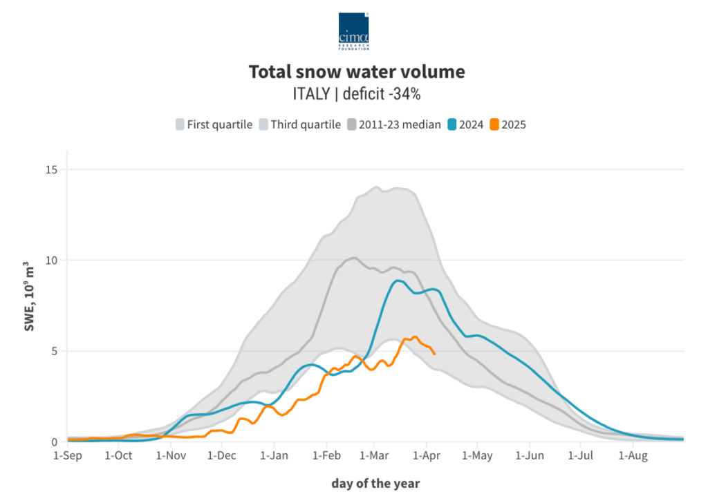 Figure 1 Total snow water volume in Italy (2024–2025): This graph shows the seasonal trend of snow water equivalent (SWE) in Italy, comparing 2025 data (orange line) with 2024 (blue line) and the historical median from 2011–2023 (grey line). The 2024–2025 winter recorded a 34% snow water deficit, with a lower peak and earlier melt compared to average conditions.