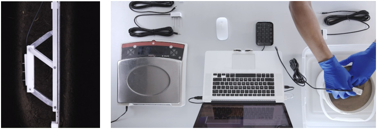 Figures 2a) Soil moisture sensors field installation (Meter Teros 11);  2b) Soil moisture calibration (Meter Teros 11)